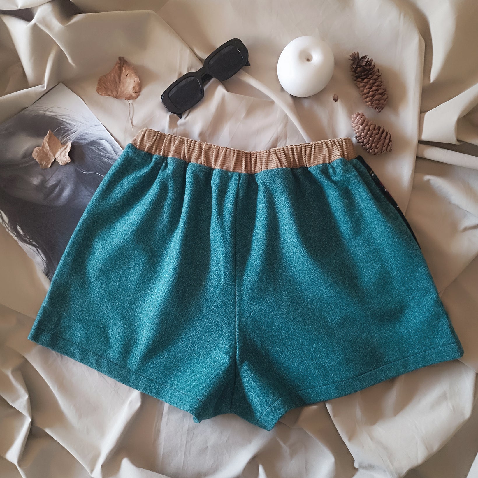 Shorts inspired by classic men's boxers but with a cut and a pronounced curl on the side to make them more feminine and with side pockets