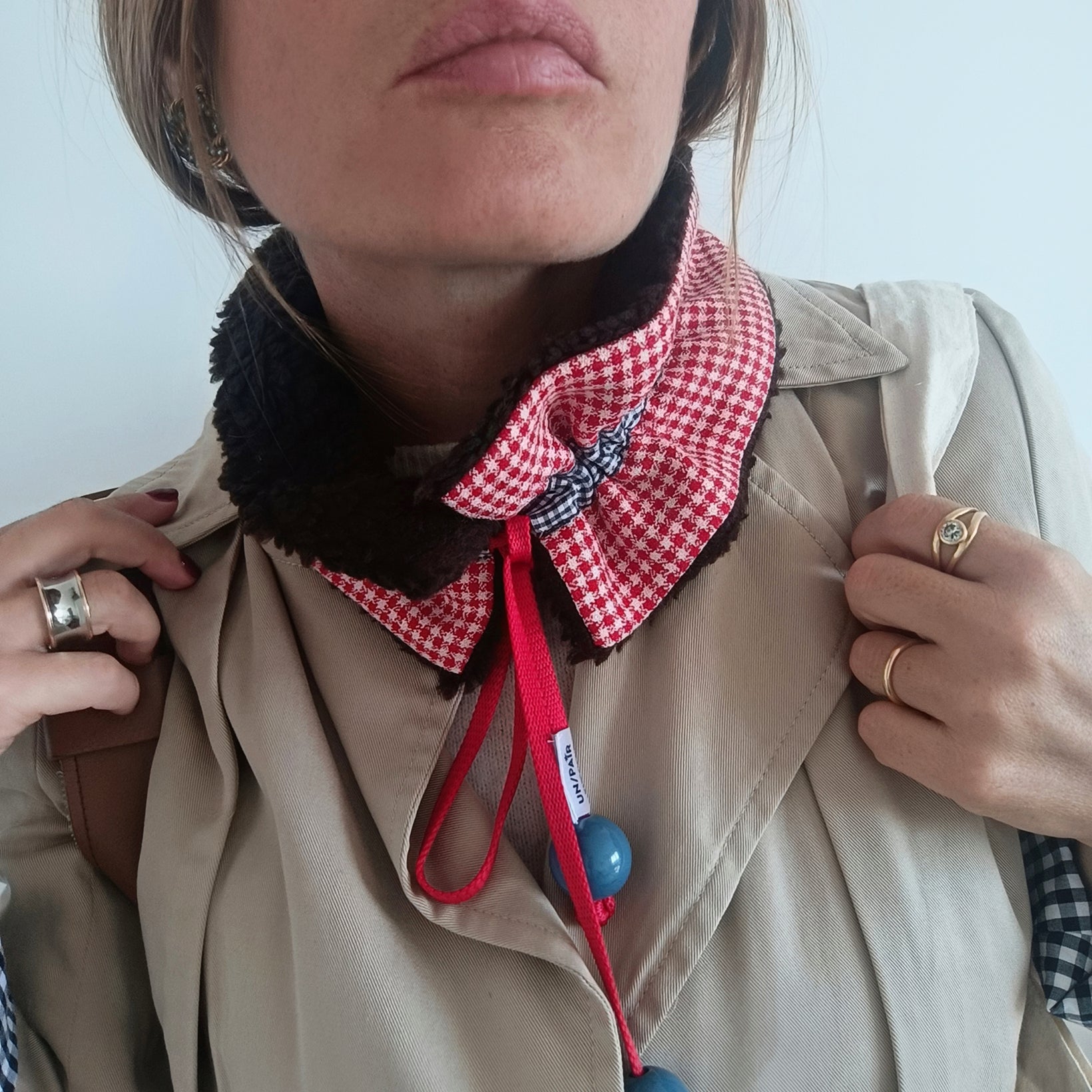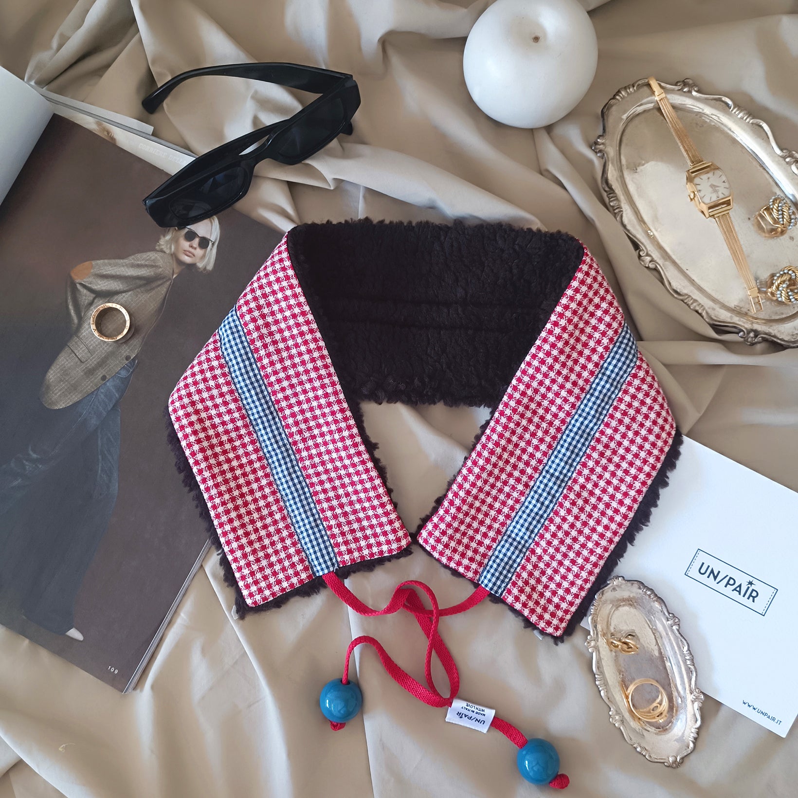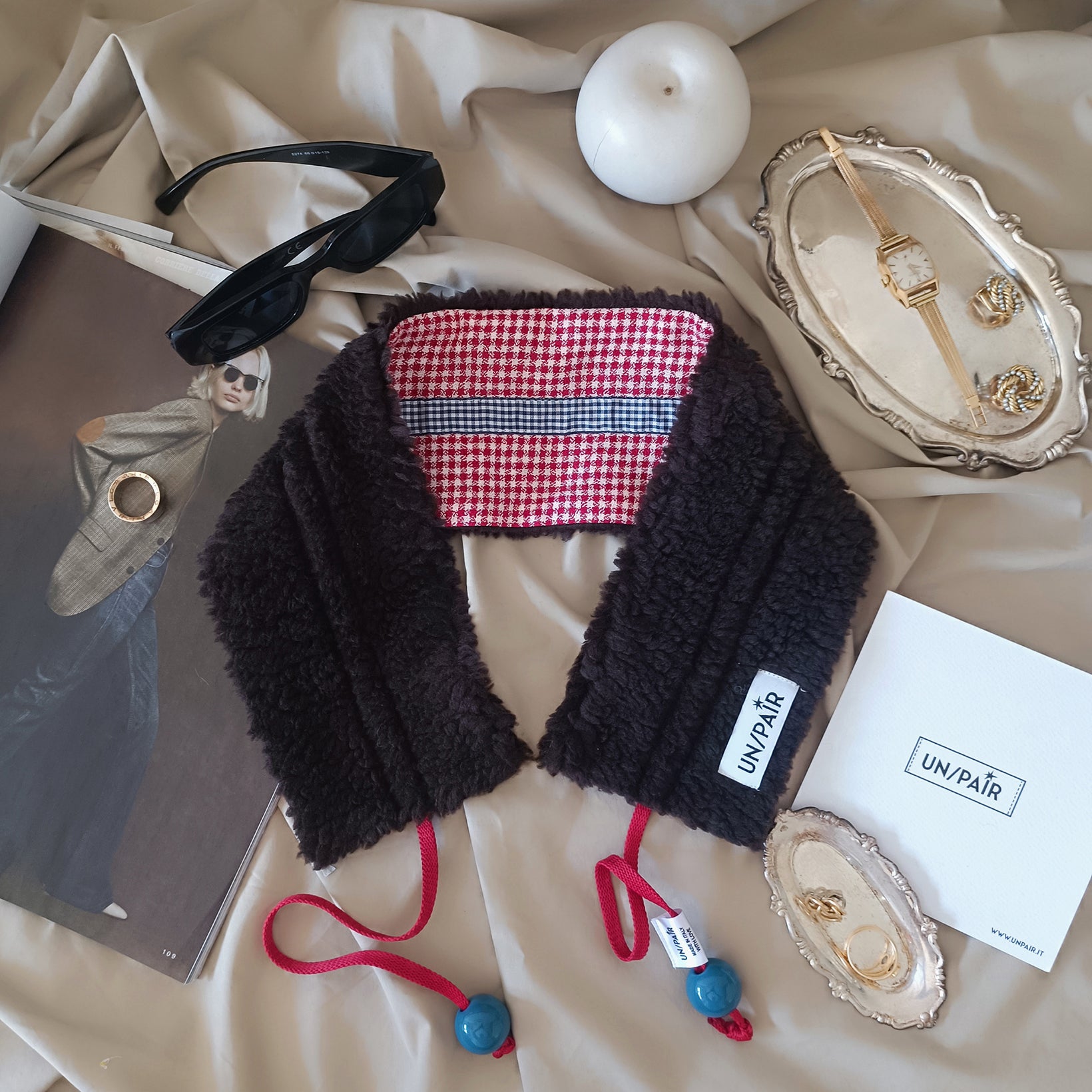 COLLAR UN/PAIR RED HOUNDSTOOTH DARK BROWN SHEEPSKIN COAT